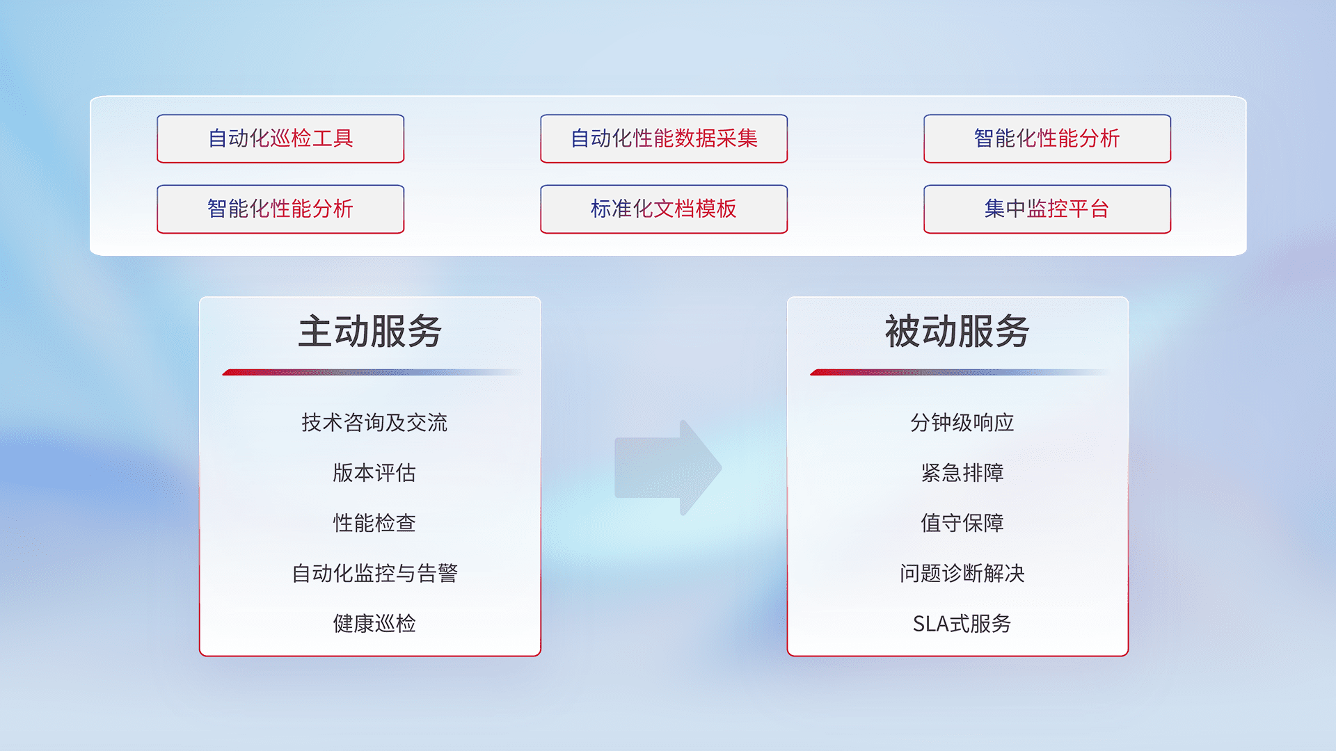 智能化工具和标准化文档,,,保障服务质量,,,,提供主动服务(包含技术咨询、、、、版本评估、、、、性能检查、、、自动化监控与告警、、健康巡检)和被动服务包含(分钟级响应、、、、紧急排障、、、值守保障、、、问题诊断解决、、SLA服务)。。